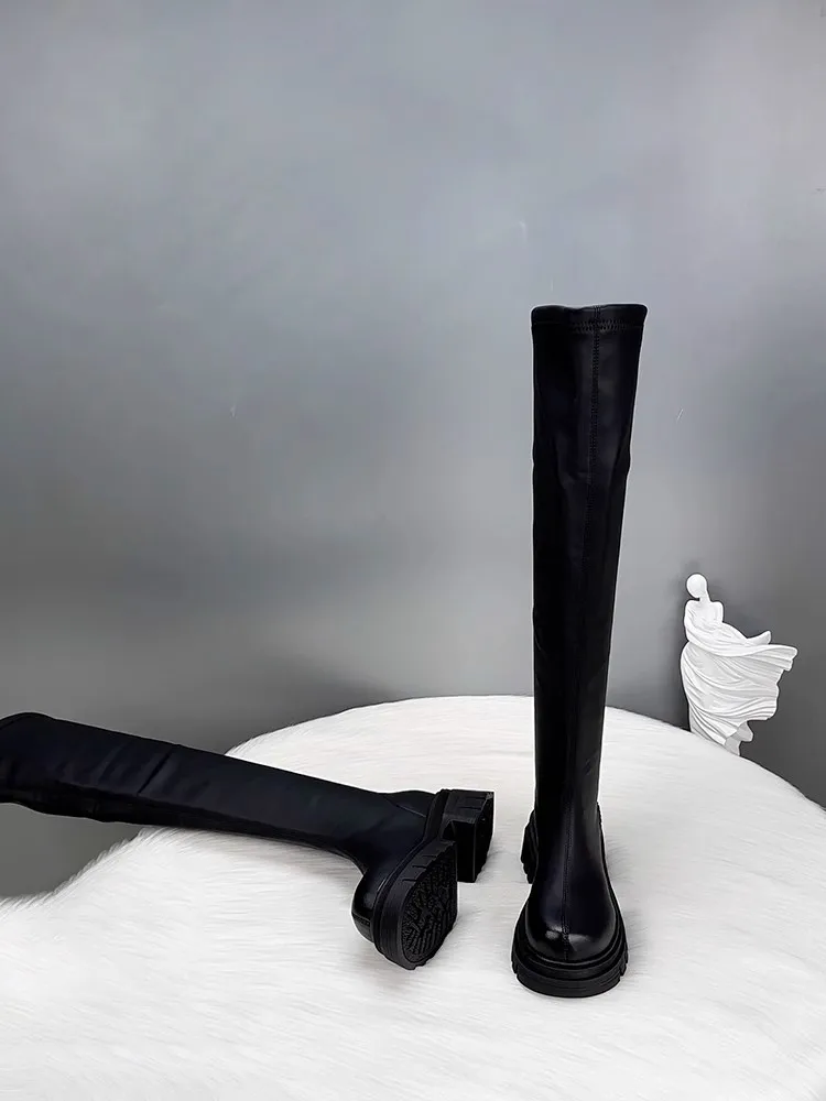 Ge din stil ett omedelbart lyft med dessa iögonfallande knähöga platåstövlar. Designade för den moderna kvinnan som vågar ta plats, kombinerar dessa stövlar en dramatisk gotisk (Goth) estetik med en trendig, chunky sula.