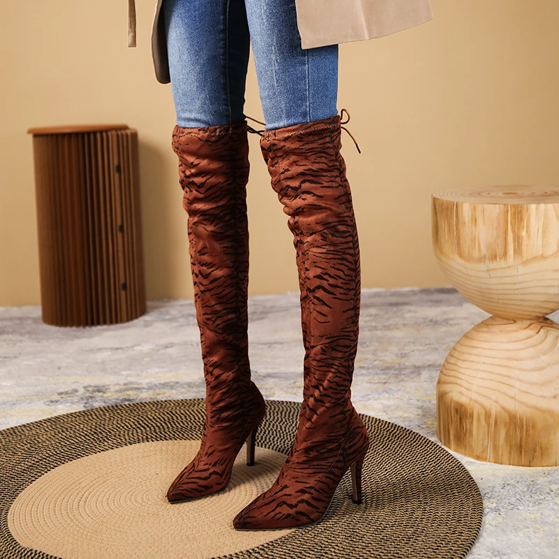 Stretchiga over-knee stövlar, dam, med leopardmönster och spetsig tå