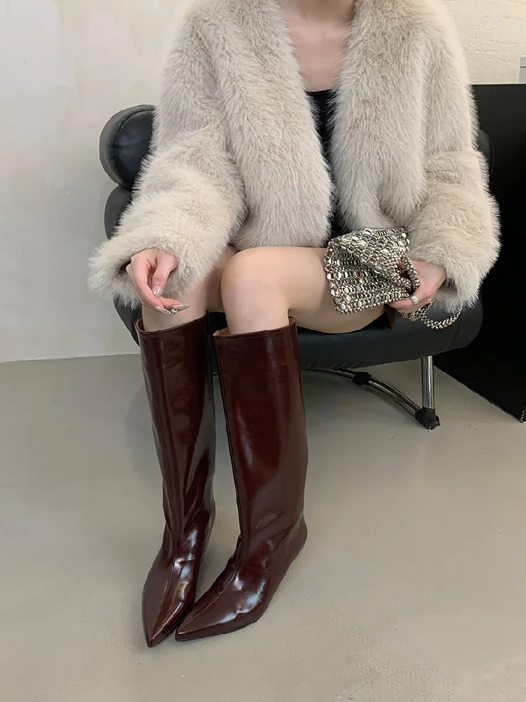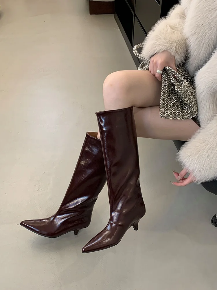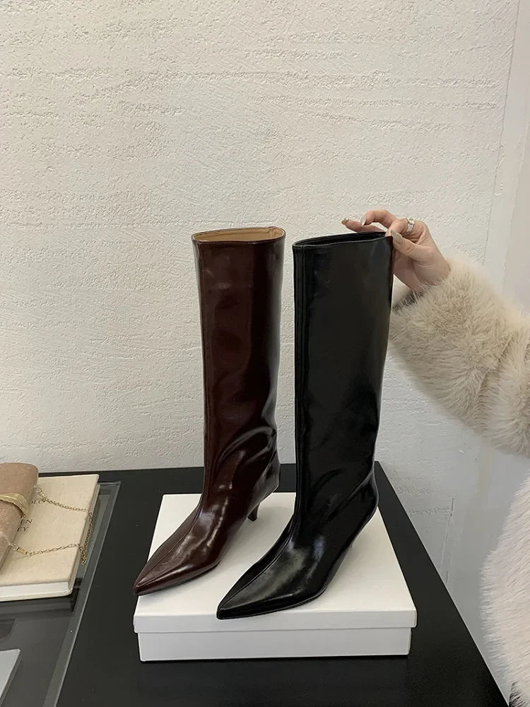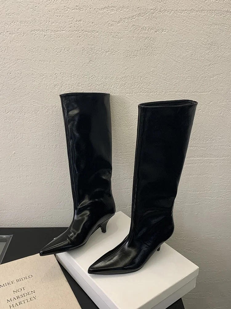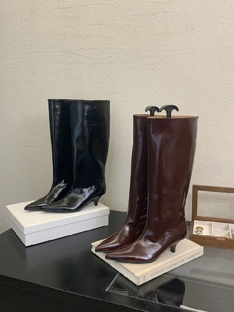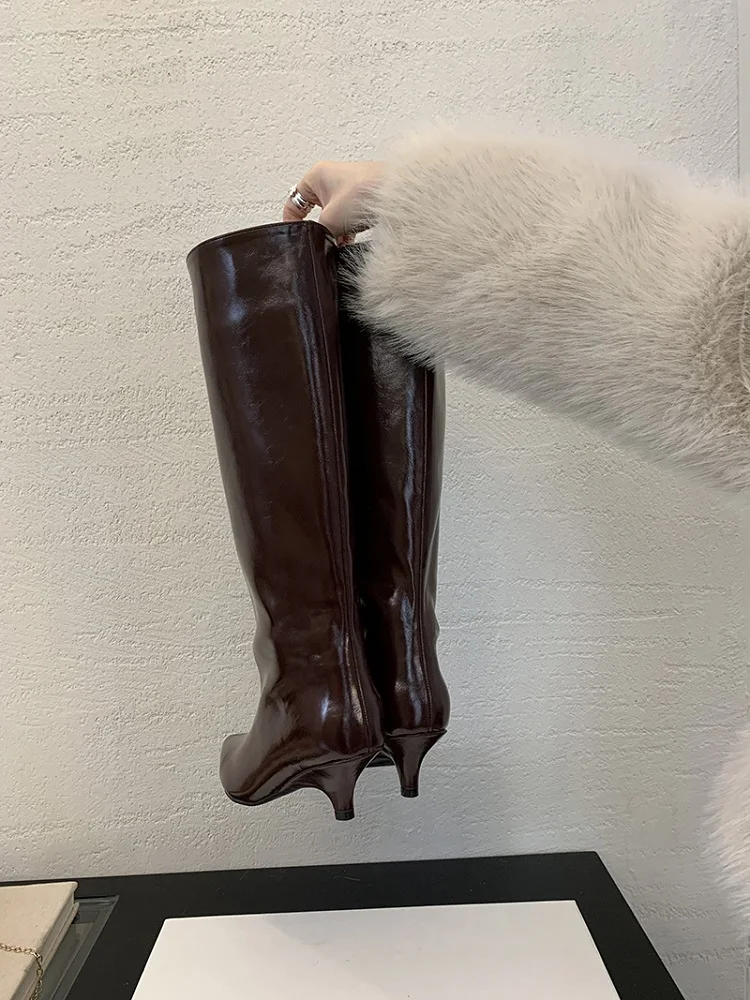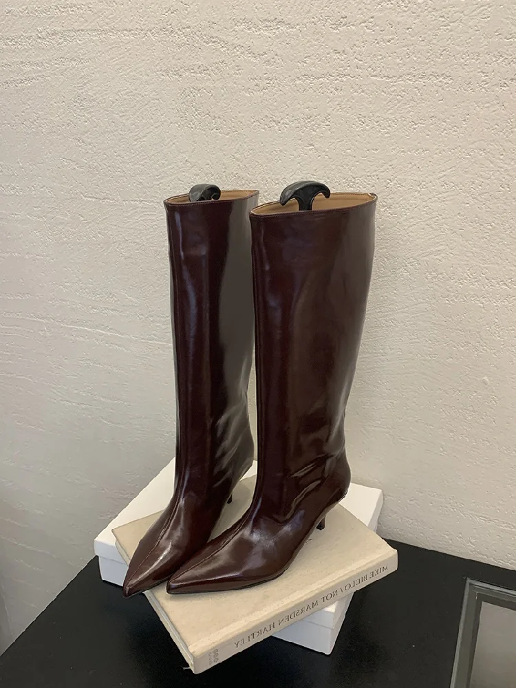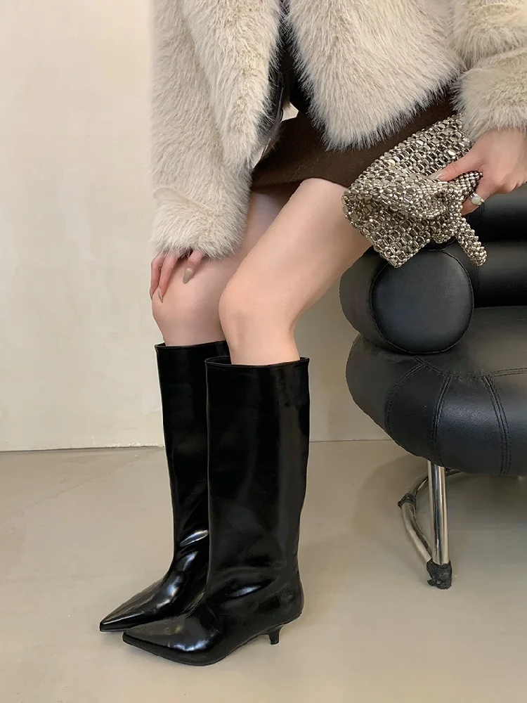 Stövlarna har en vackert formad spetsig tå som ger en tidlös och smickrande siluett. Den tunna, låga klacken ger precis tillräckligt med lyft för en elegant hållning utan att kompromissa med komforten, vilket gör att du kan bära dem från morgon till kväll. Det knähöga skaftet förlänger benen och passar perfekt att bära över smala jeans eller till en klänning och kjol.